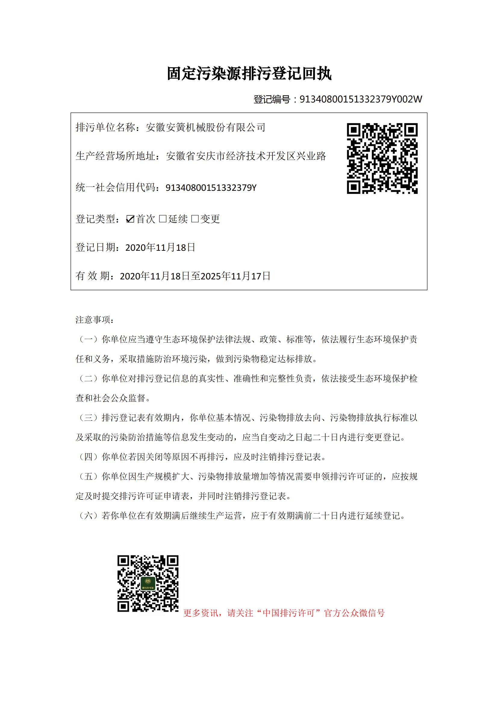 安徽安簧機(jī)械股份有限公司排污許可證明